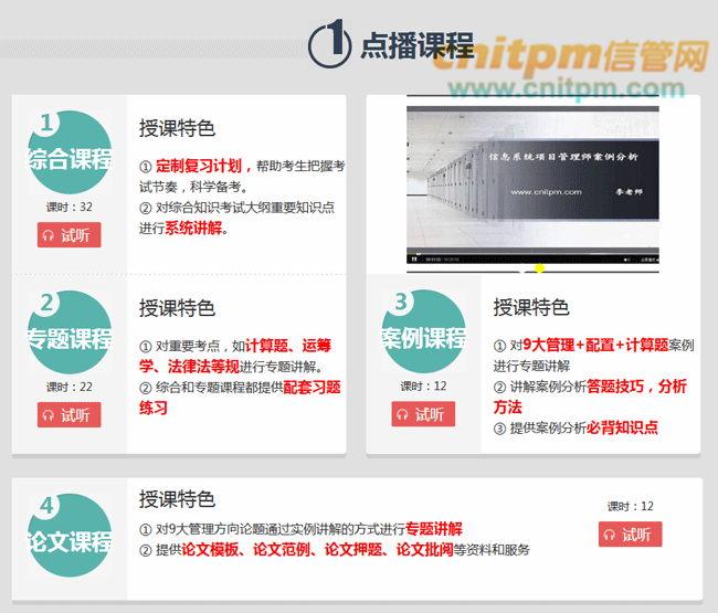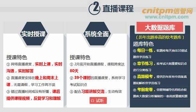 目前距离2016年下半年信息系统项目管理师考试只有3个多月了,到了备考的黄金时间,2016年JRS直播培训课程体系全面升级,点播课程、直播课程、冲刺课程三大阶段全程高效提分(查看详细),高端班、精品班、直播班多种班级供您选择,JRS直播6年专注信管服务,专业、专注、专心,只为你一次通关!