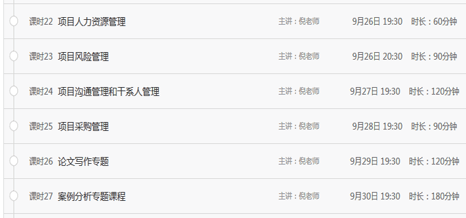 原9月25日(周日)项目人力资源管理、项目沟通和干系人管理、项目风险管理、项目采购管理直播课程整体调整到9月26日、27日、28日晚上(讲课时间:19:30开始)