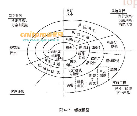 螺旋模型是一个演化软件过程模型,将原型实现的迭代特征与线性顺序(瀑布)模型中控制的和系统化的方面结合起来。使软件的增量版本的快速开发成为可能。在螺旋模型中,软件开发是一系列的增量发布。在早期的迭代中,发布的增量可能是一个纸上的模型或原型;在以后的迭代中,被开发系统的更加完善的版本逐步产生。