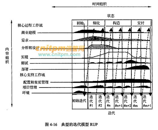 在迭代式的过程中,每个阶段都包括不同比例的所有活动。从组织管理的角度描述整个软件开发生命周期,分四个阶段:初始、细化、构造、移交,可进一步描述为周期、阶段、迭代;核心工作流从技术角度描述迭代模型的静态组成部分,包括:业务建模、需求获取、分析与设计、实现、测试、部署。