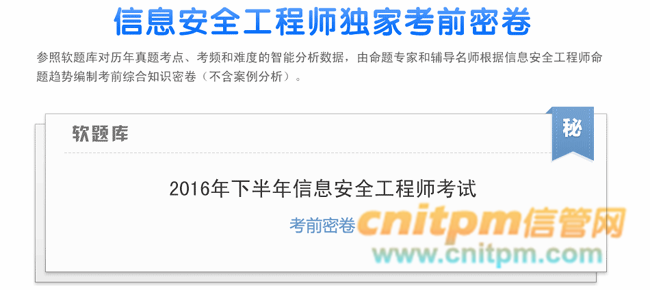 特别注意:2016下半年信息安全工程师考前密卷由软题库提供,非JRS直播服务,只包含上午综合知识一套试卷(不含下午案例分析),有解析,与当次真题无直接关系,不是YT,仅供考前模拟练习。