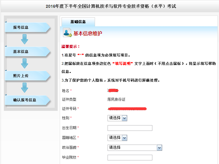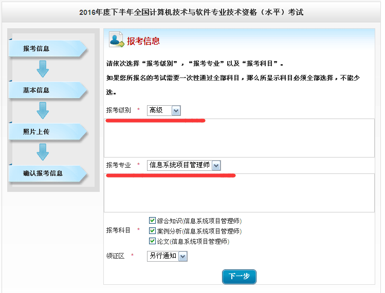 5、填写报考信息,报考级别选择高级、中级或初级,信息系统项目管理师选高级,报考专业选择信息系统项目管理师。