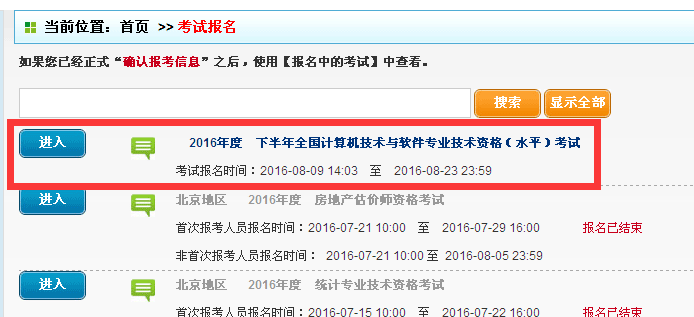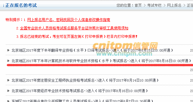 1、点击上面报名入口网址进入报名页面,注意不要使用chrome浏览器,进入后点击“北京地区2017年度下半年计算机技术与软件专业技术资格(水平)考试->进入(2017年8月16日10:00)”