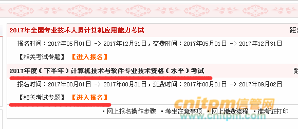 四川2017年下半年计算机技术与软件专业技术资格(水平)考试(软考)高级信息系统项目管理师与中级系统集成项目管理工程师、信息安全工程师考试报名方式为网上报名,报名网站为四川省人事考试网。