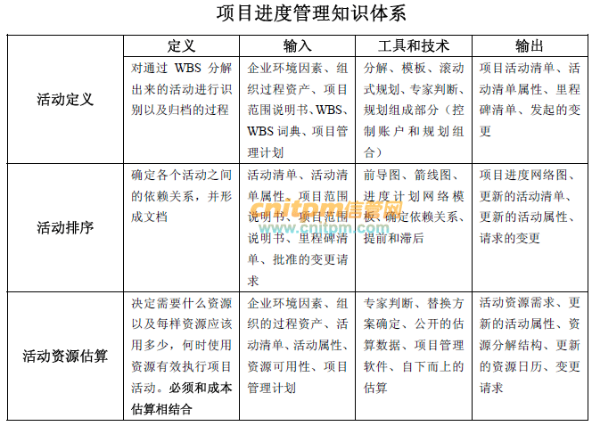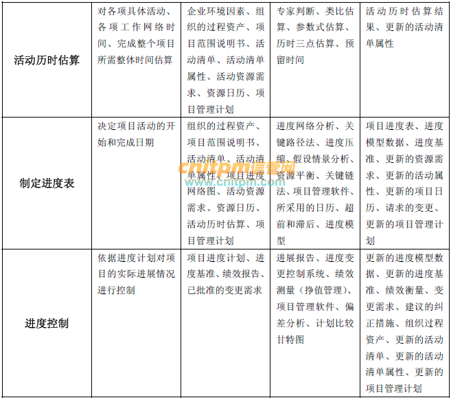5、制定进度计划:1、关键路径法,浮动时差,自由浮动。 2、进度压缩:赶工,快速跟进。3、资源平衡。4、进度基准:甘特图,里程碑图