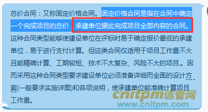 总价合同:又称固定价格合同。固定价格合同是指在合同中确定一个完成项目的总价,承建单位据此完成项目全部内容的合同。这种合同类型能够使建设单位在评标时易于确定报价最低的承建单位,易于进行支付计算。但这类合同仅适用于项目工作量不大且能精确计算、工期较短、技术不太复杂、风险不大的项目.。因而采用这种合同类型要求建设单位必须准备详细而全面的设计方案(fzyzx.cn)和各项说明,使承建单位能准确计算项目工作量。