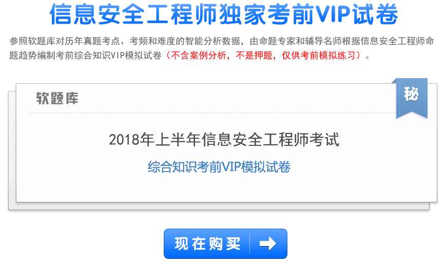 特别注意:2018年上半年信息安全工程师考前vip模拟试卷由软题库提供,非JRS直播服务,只包含上午综合知识一套试卷(不含下午案例分析),有解析,与当次真题无直接关系,不是YT,仅供考前模拟练习。