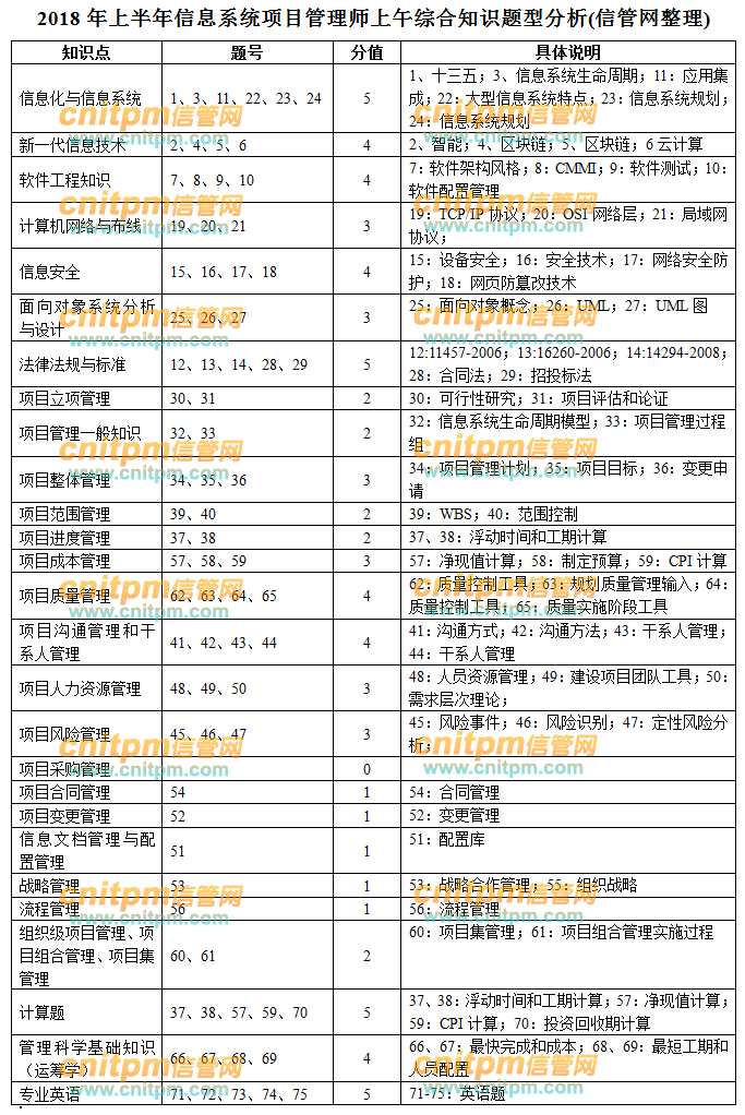 信息系统项目管理师考试知识点分布广,范围宽,涉及到信息化知识、信息技术知识、项目管理知识、计算机网络基础知识、信息安全知识、法律法规知识、组织级项目管理知识、管理科学基础知识、专业英语知识等内容。就2018年上半年高项考试来说,从大家考试后的反映以及结合试题来看,上午综合知识不是很难,但是这个不难也是建立在你进行了一定复习的基础上;案例分析这次由于计算题题型换了一种方式,有很多同学还是在这个上面有所失分,而其他二个分析题主要考到质量和人力资源管理方面;论文质量管理和人力资源管理这二个论题都是10大管理领域的,而且质量管理本来就比较热门,相信大家都准备得不错。