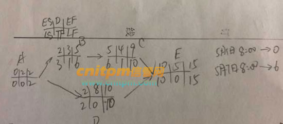 正向推导、反向推导得出B的ES为2,EF为5,LF为6,C的ES为5,EF为9,LS为6,LF为10.所以B的自由时差=C的ES-B的EF=5-5=0,B的总时差=B的LS-B的ES=3-2=1。因为B的LF为6,说明最晚可以在5月6日下班的时候完成活动B的工作内容,换句话说,也就是5月7日早上8点以前必须完成活动B的工作内容。