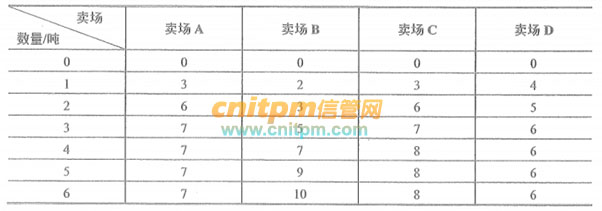 某工厂平均每月生产6吨货物,分别发往A、B、C、D四个卖场,为了便于管理,发往每个卖场的货物数量为整数吨,如果各卖场出售该货物获得的利润,如下表所示。每个月给四个卖场分配多少货物,能让总利润最大。