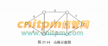 山区某乡的6个村之间有山路,如图27-14所示,其中的数字标明了各条山路(公里)。乡政府决定沿山路架设电话线。为实现村村通电话,电话线总长至少为()公里。
