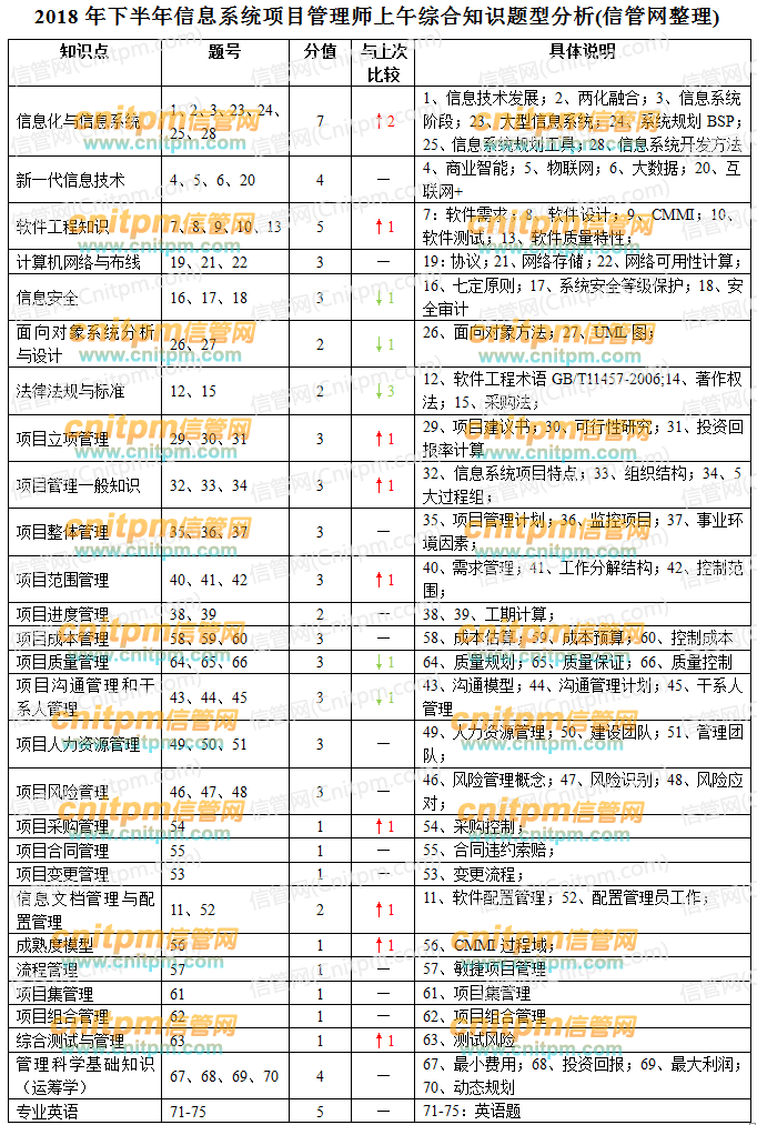 这次上午综合知识从题型来看,还是大而全,考到的知识点很多,尤其加大了对新教程上新内容的考核。上午的考试必须要多做题,建议大家进入软题库答题,软题库里的题目不但包含信息系统项目管理师的历年真题而且还包含了历年其它软考科目的题目,并且按知识点进行了分类(地址:www.ruantiku.com)。