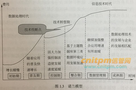 诺兰认为,任何组织由手工信息系统向以计算机为基础的信息系统发展时,都存在着一条客观的发展道路和规律。数据处理的发展涉及到技术的进步、应用的拓展、计划和控制策略的变化以及用户的状况4个方面。诺兰将计算机信息系统的发展道路划分为6个阶段:初始期、普及期、控制期、整合期、数据管理期和成熟期。诺兰强调,任何组织在实现以计算机为基础的信息系统时都必须从一个阶段发展到下一个阶段,不能实现跳跃式发展。如图1.3所示。
