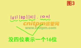 二进制转换成十六进制的方法是,取四合一法,即从二进制的小数点为分界点,向左(或向右)每四位取成一位,如图3所示。