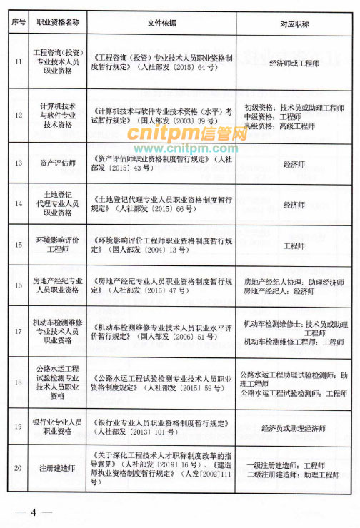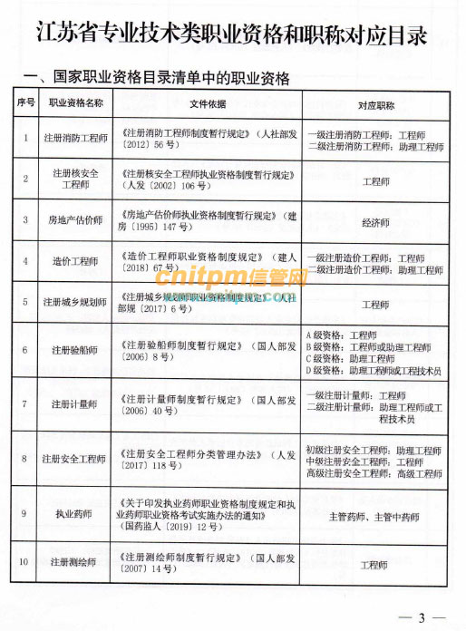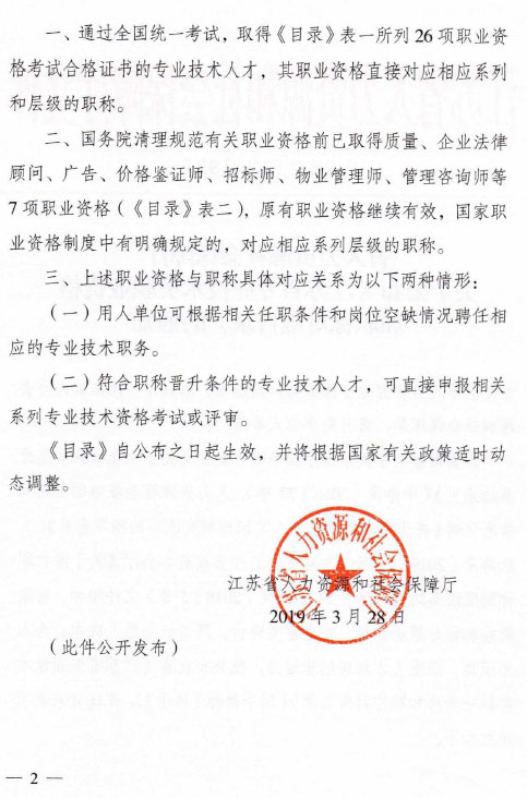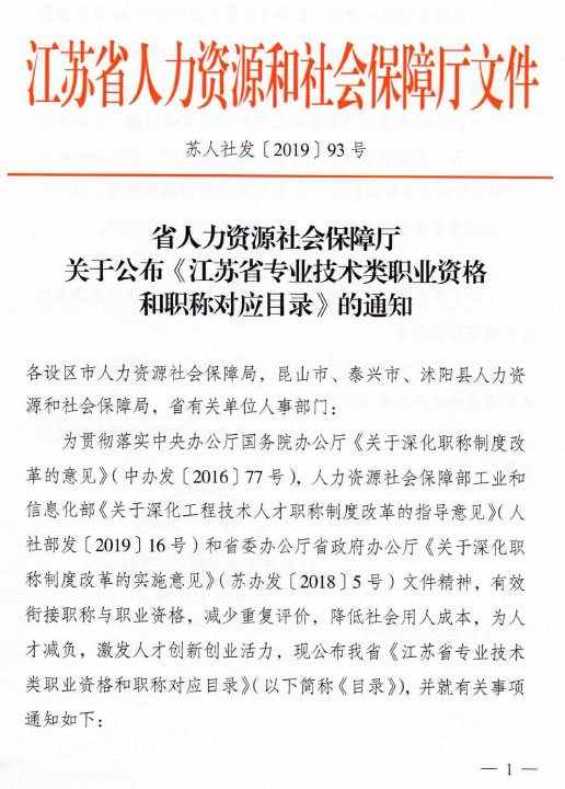 2019年3月江苏省人社厅公布《江苏省专业技术类职业资格和职称对应目录》(苏人社发〔2019〕93号),打通了职业资格和职称的对应通道。