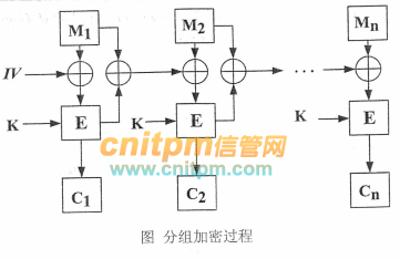 65、在下图给出的加密过程中Mi,i=1,2,…,n表示明文分组,Ci,i=1,2,…,n表示密文分组,IV表示初始序列,K表示密钥,E表示分组加密。该分组加密过程的工作模式是( )。