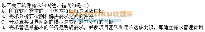 未指定试题:以下关于软件需求的说法,错误的是()A、所有软件需求的一个基本特征就是可验证性B、需求分析