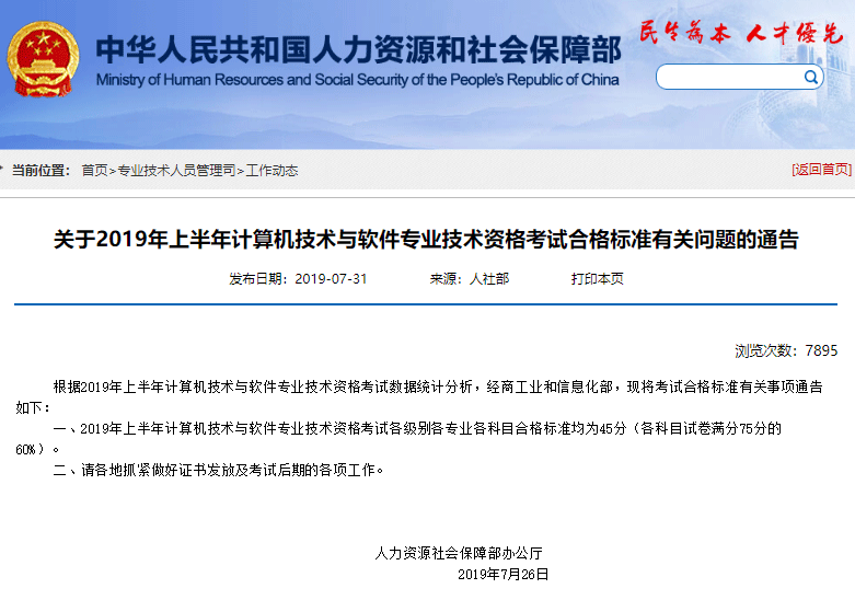 最新通知:2019年上半年软考各级别各资格各科目合格标准为45分