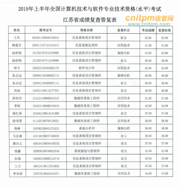 2019年上半年江苏省共有11位信息系统项目管理师考生提交了成绩复查申请,其中申请2019上半年信息系统项目管理师论文成绩复核的考生9位,他们原论文成绩为35至41不等,申请2019上半年信息系统项目管理师案例分析成绩复核的考生2位,原成绩为40和43,经过工业和信息化部教育与考试中心的核查,以上11位申请2019上半年信息系统项目管理师成绩复查考生原成绩无误,所以这也提醒考生,成绩复核基本是没用的,大家也不要浪费精力去做这个事了,安心备考下次考试。