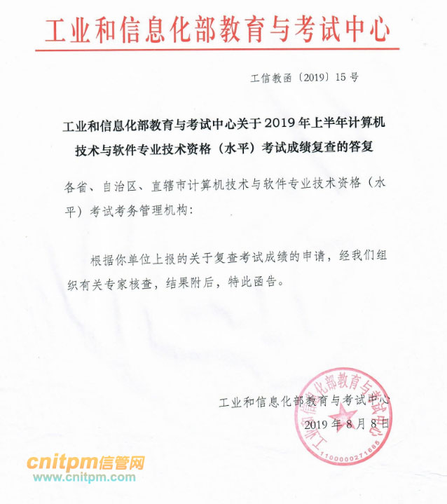 以下为工业和信息化部教育与考试中心关于2019上半年软考成绩核查答复通知。