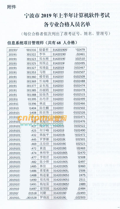 2019年上半年浙江宁波软考合格人员名单已公布,根据数据统计,浙江宁波共有68人获得高级信息系统项目管理师证书,以下为2019上半年浙江宁波信息系统项目管理师合格人员名单: