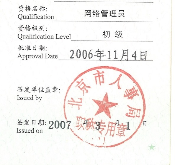 第一次软考考试,在一所中学,30个人的考场空荡荡的,只有几位年纪较大的中年男人一起(没想到后来,我也是他们中的一员)。浑浑噩噩地考完,查成绩,交审核表,收到快递来的绿色软考证书,扔抽屉(因为找工作没一点用)。