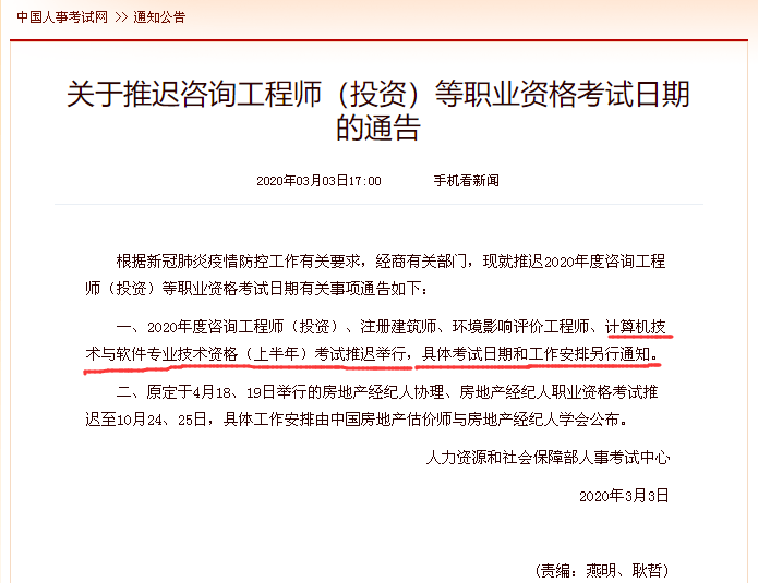一、2020年度咨询工程师(投资)、注册建筑师、环境影响评价工程师、计算机技术与软件专业技术资格(上半年)考试推迟举行,具体考试日期和工作安排另行通知。