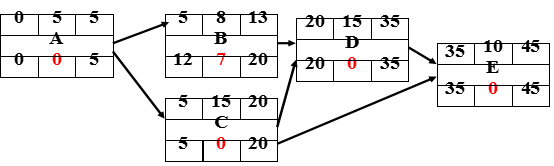 解析:用前推法和后推法分别找出每一活动的最早开始日期、最早结束日期、最迟开始日期和最迟结束日期,然后计算出每一活动的总时差。活动总时差都是“0”的路径就是关键路径。