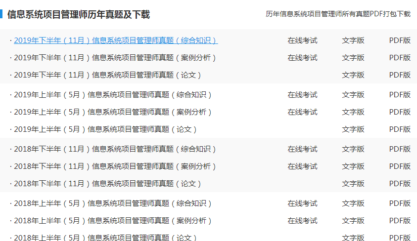 为便于广大信息系统项目管理师考友备考2020年信管考试,JRS直播汇总了从2005年信息系统项目管理师开考至2020年的所有历年真题供各位考友在线答题、查看和下载。同时为方便各位考友下载,特将2005至2020年的所有信息系统项目管理师真题打包为一个文件提供给各位学员免费下载,该打包文件包含信息系统项目管理师历次考试的综合知识、案例分析和论文的试题,同时大部分试题都包含解析,是备考2020年信息系统项目管理师考试必不可少的资料。