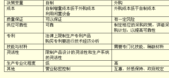 自制的考虑:期望成本更低、业务功能更全面且便于操作、保密需要、利用闲置的现有资源、避免对供应商的依赖、避免不可靠的供应商、稳定现有的人力资源、保证产品的质量、需求独特。