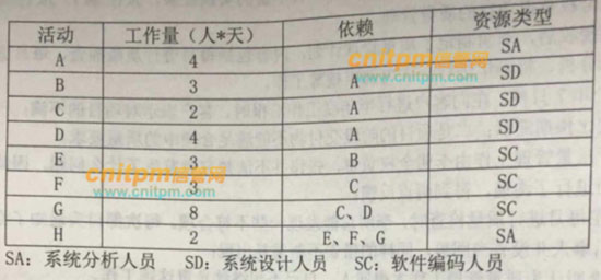 某软件项目包含8项活动,活动之间的依赖关系,以及各活动的工作量和所需的资源如下表所示。假设不同类型的工作人员之间不能互换,但是同一类型的人员都可以从事与其相关的所有工作。所有参与该项目的工作人员,从项目一开始就进入项目团队,并直到项目结束时才能离开,在项目过程中不能承担其他活动。(所有的工作都按照整天计算)
