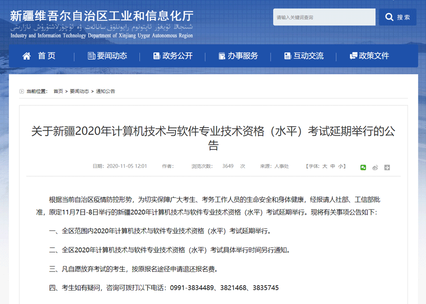 新疆维吾尔自治区工业和信息化厅官网于2020年11月5日发布了《关于新疆2020年计算机技术与软件专业技术资格(水平)考试延期举行的公告》,原定11月7日-8日举行的新疆2020年计算机技术与软件专业技术资格(水平)考试延期举行。