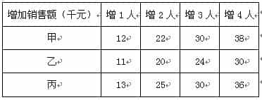 某公司准备将新招聘的4名销售员分配到下属3个销售点甲、乙和丙。各销售点增加若干名销售员后可增加的月销售额如下表:根据此表,只要人员分配适当,公司每月最多可以增加销售额( )千元。