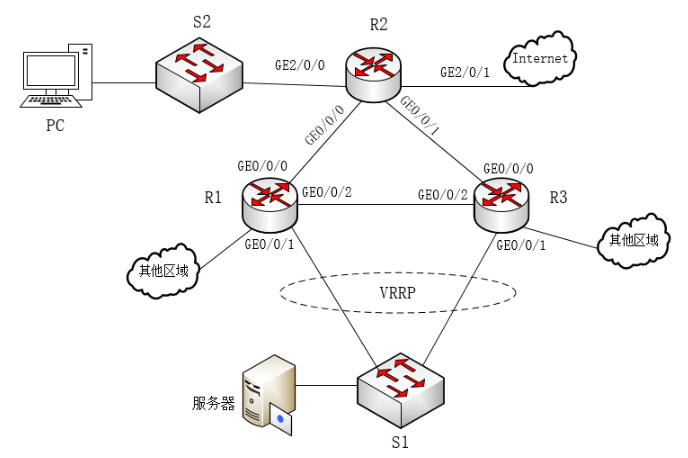 通过配置虚拟路由冗余协议(Virtual Router Redundancy Protocol,简称VRRP)通过交换机S1为S1双归属到R1和R3,从而保证链路发生故障时服务面的业务不中断,R1为主路由,R3为备份路由,且虚拟浮动IP地址为10.2.2.10。