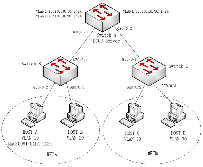 根据业务要求,在部门A中,新加入的MAC地址为0081-01fa-2134,主机HOST A需要加入VLAN 10并获取相应IP地址配置,连接在交换机SwitchB的GE0/0/3接口上的主机需加入VLAN20并获取相应IP地址配置,部门B中的所有主机应加入VLAN30并获取相应IP地址配置。