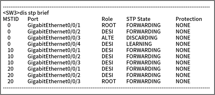 交换机SW3生成树信息如下图所示,下列关于该交换机生成树的说法中正确的是()。A.交换机SW3的生成树模式为RSTPB.Instance 20MST域内,GigabitEthernet0/0/1为GigabitEthernet0/0/2、GigabitEthernet0/0/3的备份端口C.SW3为Instance 20MST域的根桥D.SW3为Instance 10MST域的根桥