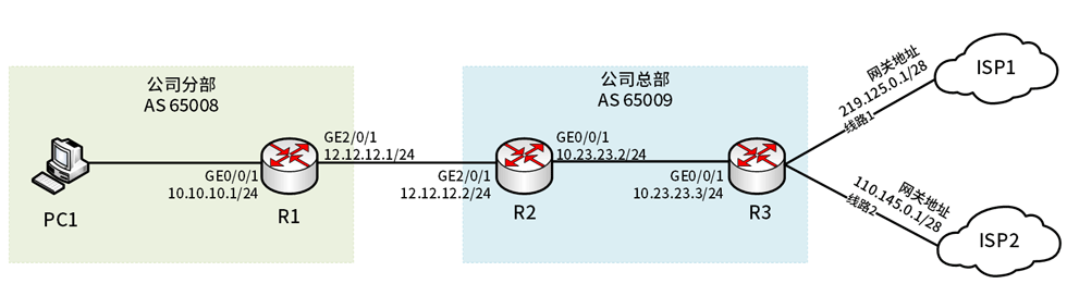 公司总部与分部通过BGP传递路由,补全下列R1的BGP功能配置命令: