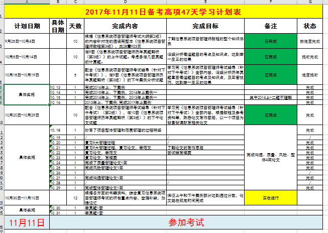 对于论文的复习,我计划了10天来完成。首先是学习考试辅导书中优秀论文的写作方法、格式,然后尝试编写项目摘要、正文、结尾。在整个论文复习的整个过程中,我都是配合10大管理47个过程组来进行,因为这才是论文的魂。大家可能觉得这么多过程组很难背下来,事实也确实如此,但是当你尝试着写完甚至抄写完一篇论文后,你会豁然开朗!比如我在写完第一篇论项目的质量管理的论文后,对质量管理的过程组基本就做到心中有数了。所以复习项目管理的精髓实际在写论文上。论文的摘要和结尾大家一定要熟烂于胸,这样在考试时不仅节省时间,还可以发散你的思维。此次考试我准备了4篇论文,质量管理、风险管理、沟通管理、整体管理,但是很遗憾都没考到,允许我郁闷几分钟。